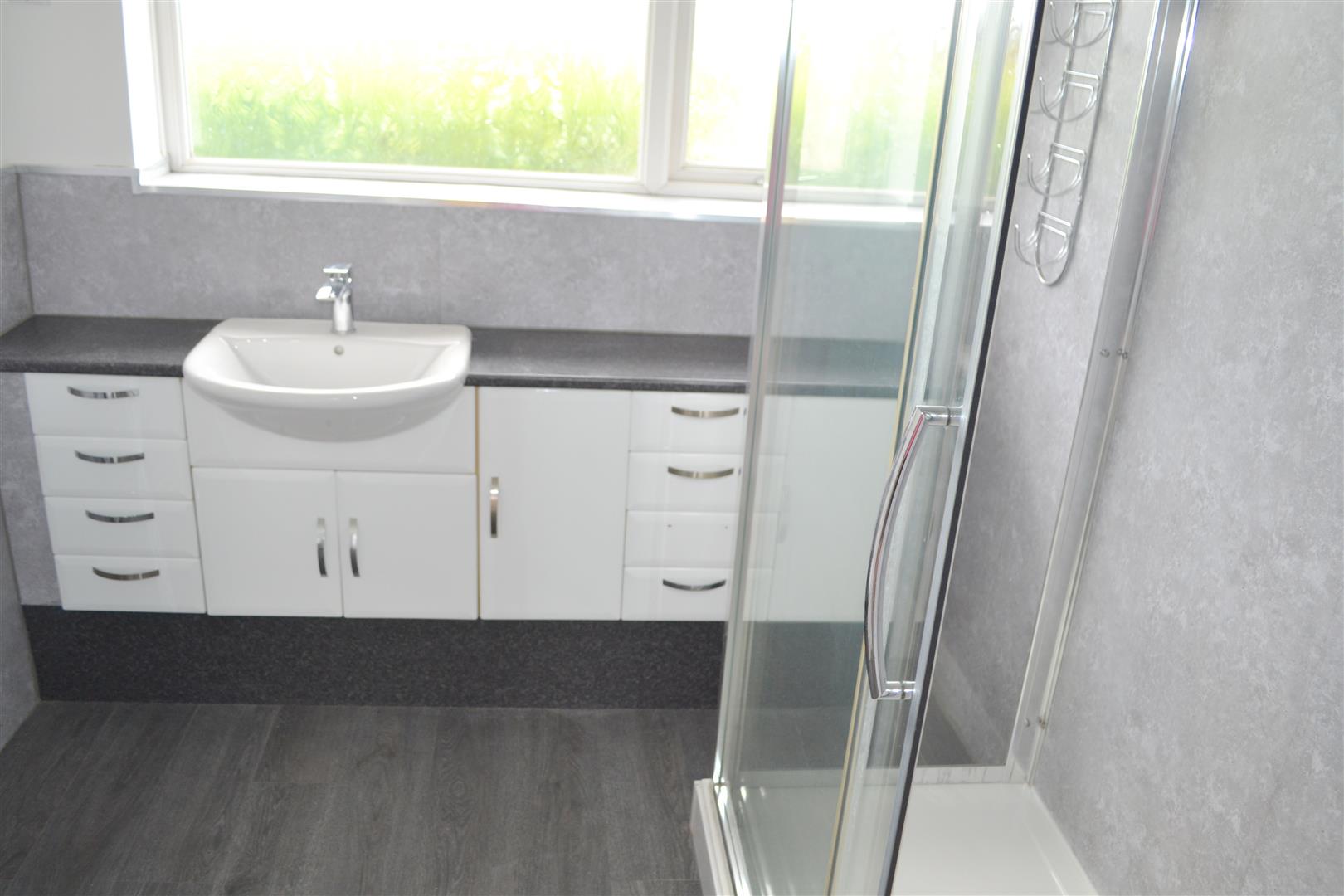 Contemporary with a modern walk in showrer, inset wash hand basin (with a range of cupboards and drawers) and wc. Being mostly tiled with a frosted window to the Rear
