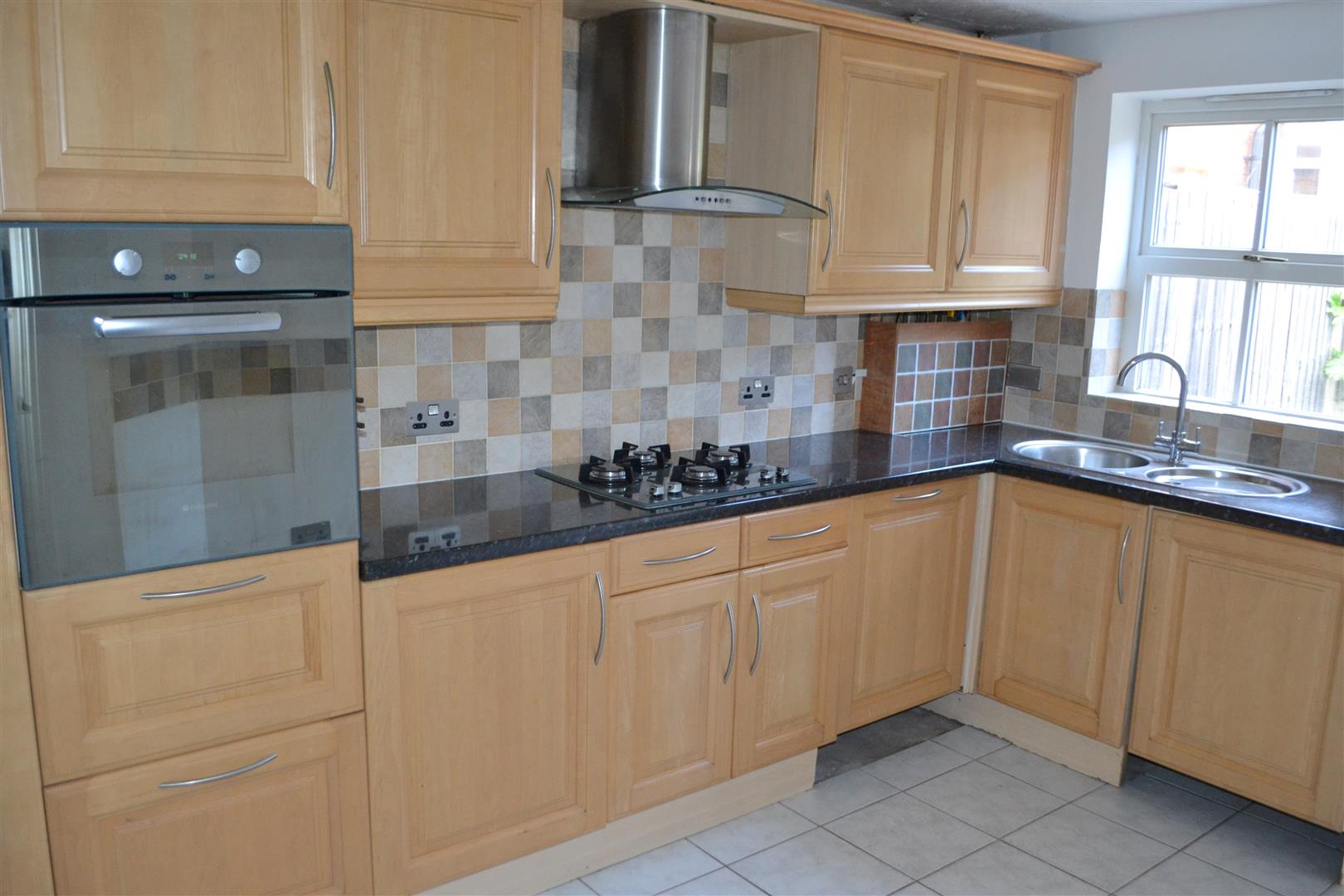 Kitchen having a range of wall and base units, gas hob and electric oven and with plumbing for appliances.