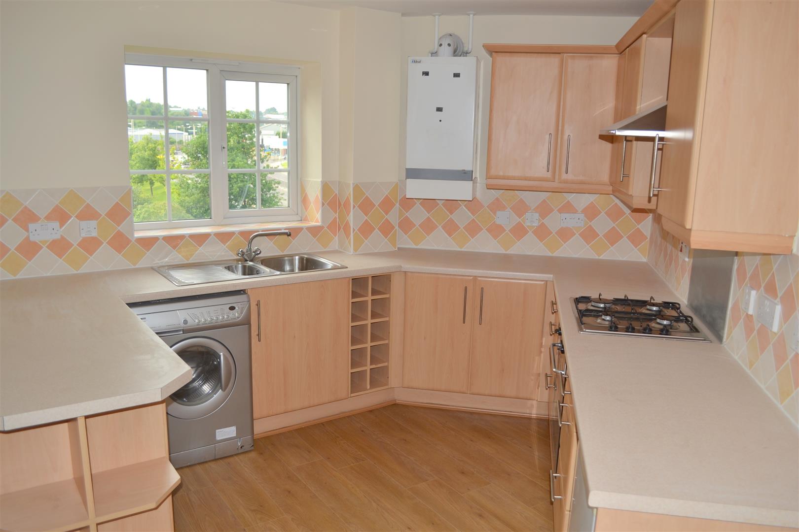 A CONTEMPORARY fitted kitchen with wall and base units, double glazed window to front, stainless steel sink and drainer, work surfaces with tiled spashback, integrated electric oven, gas hob and stainless steel cooker hood over, plumbing for washing machine, space for fridge/freezer, wall mounted boiler, breakfast bat, laminated flooring and opening to lounge/dining room.