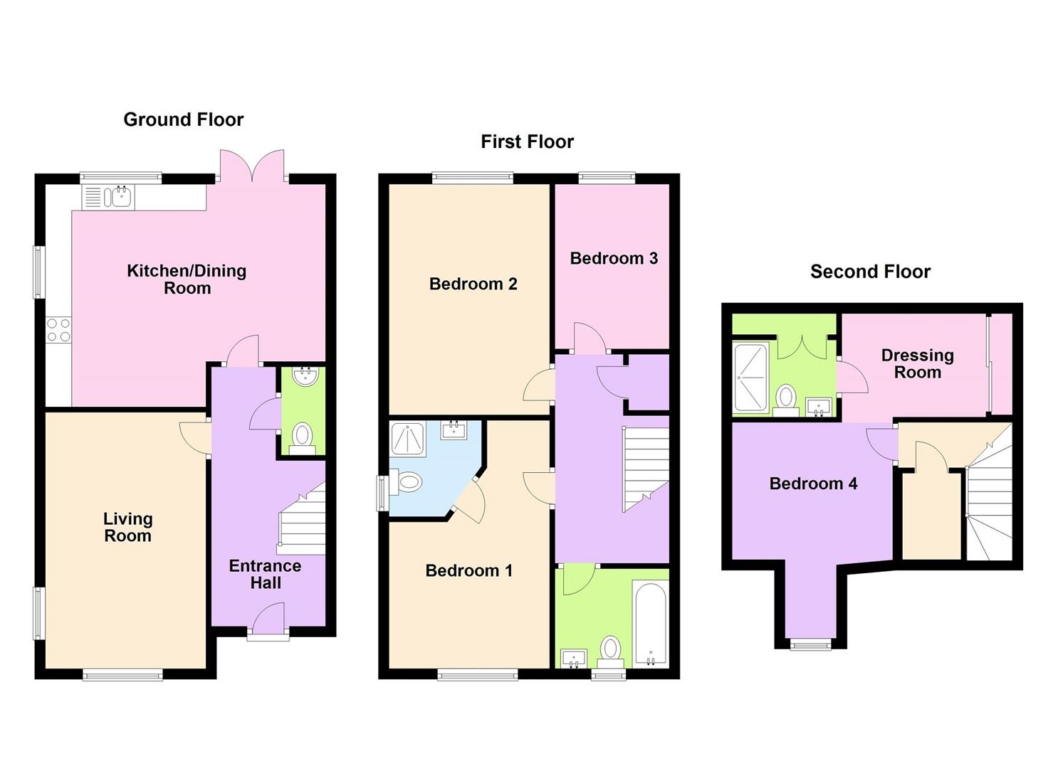 Stairs from the entrance hallway lead up to first floor landing. Separate doors open into a master bedroom with ensuite; three further bedrooms; and a family bathroom. Door opens into built-in cupboard.